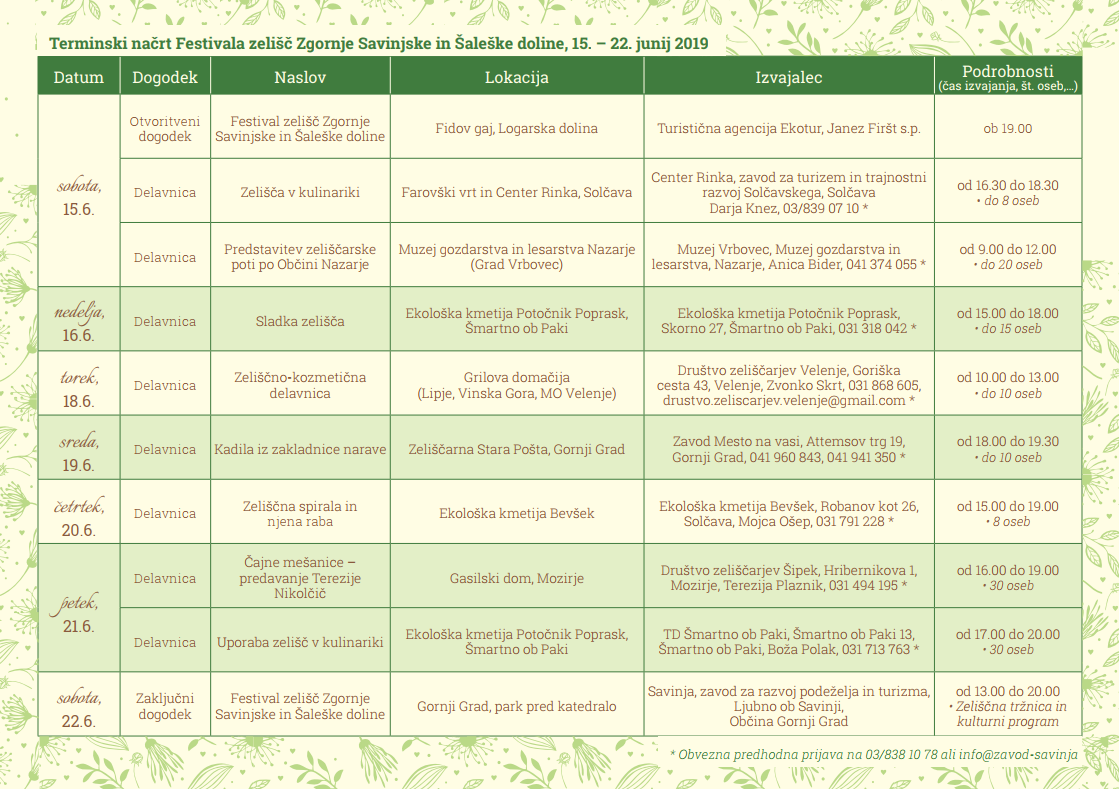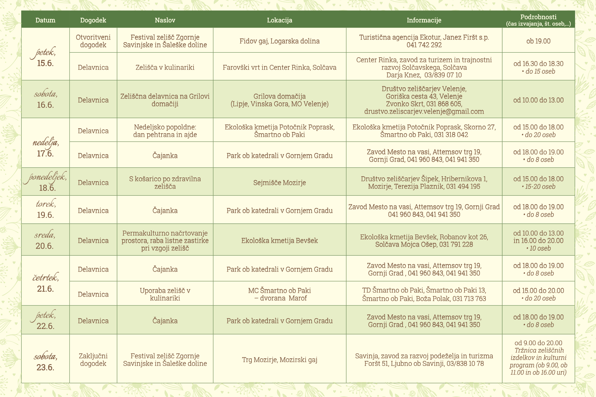 LAS Zgornje Savinjske in Šaleške doline v mesecu juniju organizira Festival zelišč Zgornje Savinjske in Šaleške doline, ki bo potekal na območju obeh dolin. Otvoritev Festivala bo 15.6. v Fidovem gaju, v Logarski Dolini, zaključni dogodek pa bo potekal v soboto, 22. junija v Gornjem Gradu. Skozi celoten teden Festivala se bo izvajal bogat program delavnic na temo gojenja in predelave zelišč, na različnih lokacijah po obeh dolinah. Še posebej pester bo kulturni program zaključnega dogodka, ki se bo zaključil s koncertom skupine Kvatropirci.